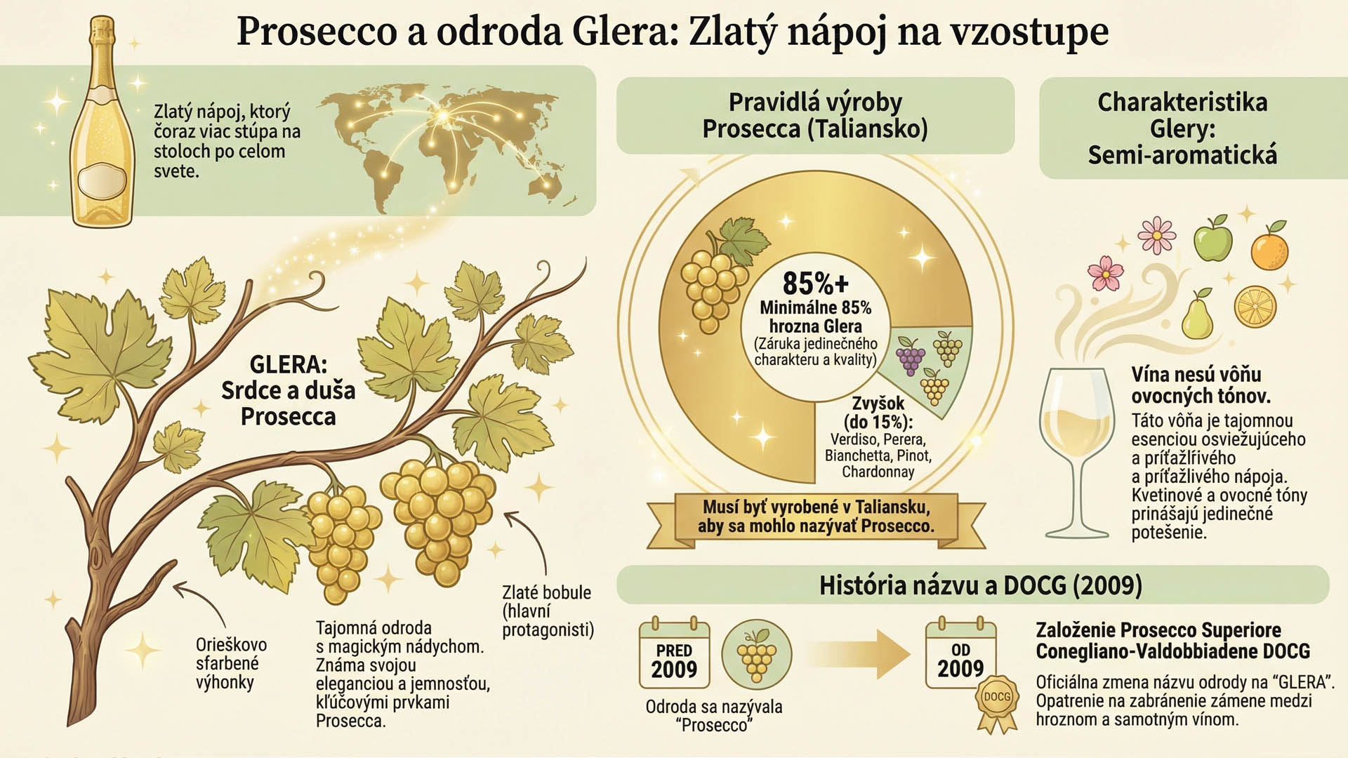 Prosecco - zlatistý nápoj, ktorý sa stále viac týči na stoloch po celom svete. V jeho srdci a duši nájdeme hrozno Glera.